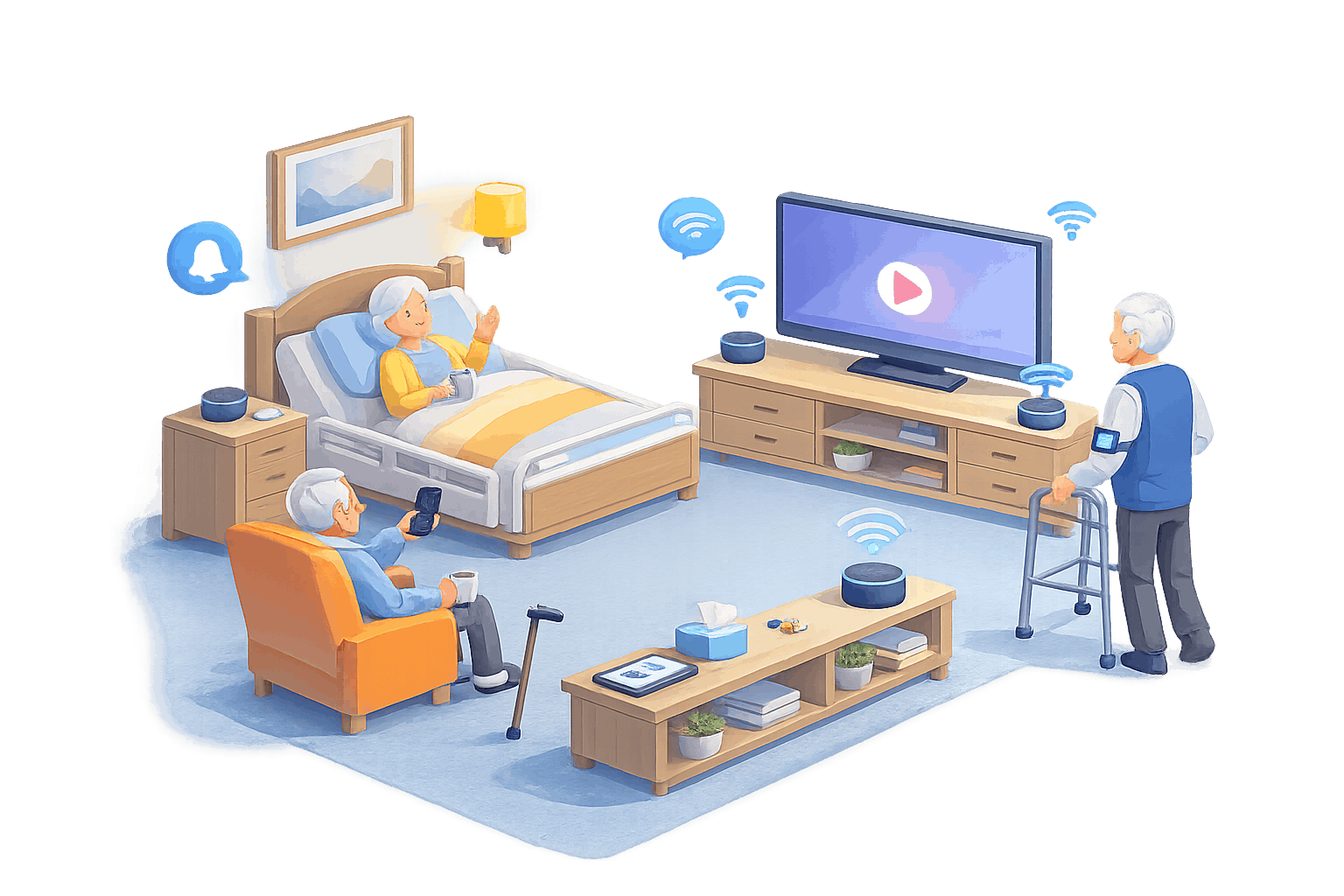 Nous nous déplaçons à domicile ou en EHPAD pour mettre en place des solutions d’objets connectés permettant aux personnes dépendantes de contrôler leur environnement (TV, lumières, équipements) simplement grâce à la voix.